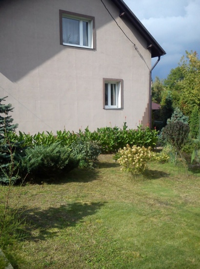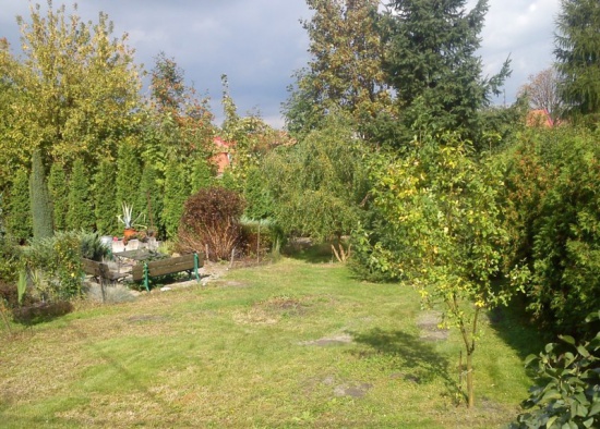 Kształt działki regularny, prostokątny o lekkim nachyleniu w kierunku północnym. Wymiary: szerokość od frontu ok. 14 m oraz długość ok. 25 m. Ogród zagospodarowany krzewami i drzewami ozdobnymi. Możliwość wykorzystania własnej studni do podlewania. Ogrodzenie drewniane i brama wjazdowa wykonane zostały w 2012 roku. Dojazd drogą asfaltową.