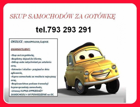 W trosce o Twój komfort dojeżdżamy zarówno do większych miejscowości jak i mniejszych. Siedzibą naszej firmy znajduje się w województwie małopolskim , jednak bez dodatkowych kosztów dojeżdżamy do każdego miejsca w Małopolsce i na Śląsku. Wystarczy wysłać SMS lub e-mail i czekać na kontakt telefoniczny. Kupujemy samochody z lat 1990-2014. Stan techniczny i model obojętny. Interesuje nas każde auto. Cały Śląsk i Małopolska